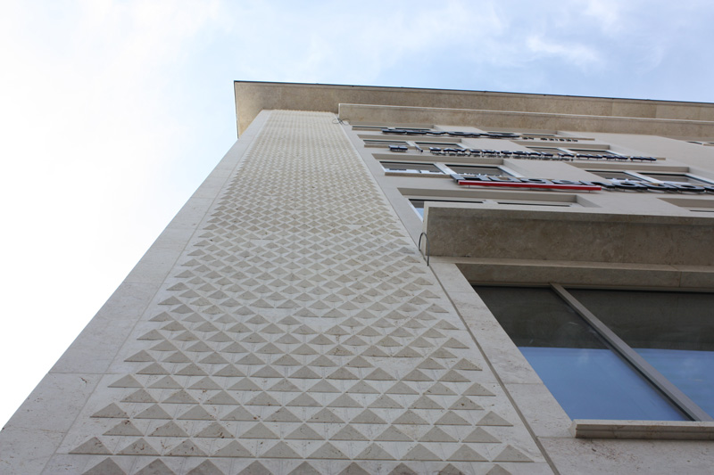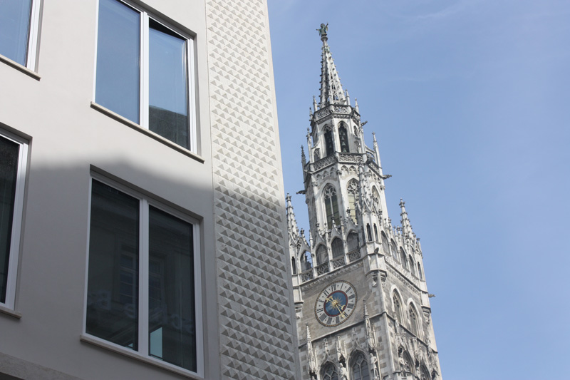 Das Gebäude am Marienplatz 22 liegt vis-á-vis zum Neuen Rathaus inmitten der Münchener Innenstadt. Ein Jahr lang war der Gebäudekomplex hinter Gerüstbau und Bauplane verdeckt, bis es Anfang Mai 2017 enthüllt wurde. Zum Vorschein kam eine ruhige und farblich einheitliche Fassade, die erst auf den zweiten Blick ihr besonderes Design erkennen lässt. Die plastische Natursteinfassade wurde mit pyramidenförmigen Diamanti gestaltet, die im Wechsel von glatten Putzflächen und Gesimsen, die Fassade verzieren.
